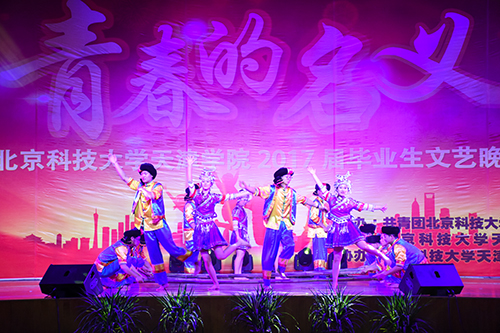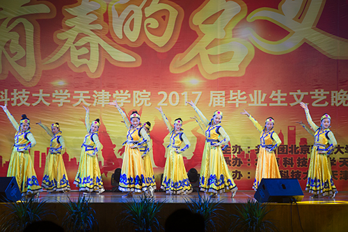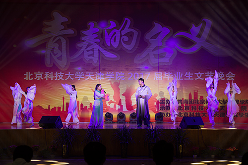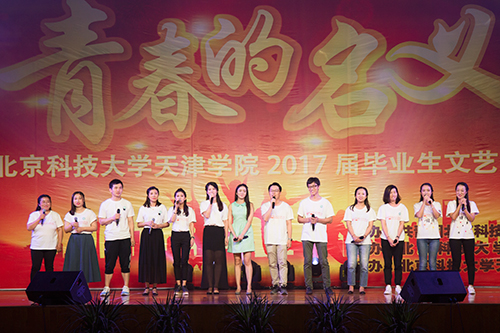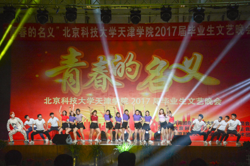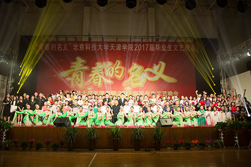 5月24日19:00,“青春的名義”北京科技大學天津學院2017屆畢業生文藝晚會在學院體育館隆重舉行。北京科技大學天津學院黨委書記、院長王斌,黨委副書記白亮、葉振楠,教務處處長張建華,土木系主任劉勝富,材料系主任沈衛平,法律系主任朱京安,黨建辦主任郭雅娟,國際交流處處長柯瑜,經濟系黨總支書記范麗麗,材料系黨總支書記羅富臣,學生處副處長、土木系黨總支書記孟祥瑜,管理系黨總支書記王軍,法律系黨總支書記馮海燕,外語系黨總支書記張莉,藝術系副主任林碧蕓和團委書記殷實等嘉賓出席晚會并和2017屆畢業生一起觀看演出。