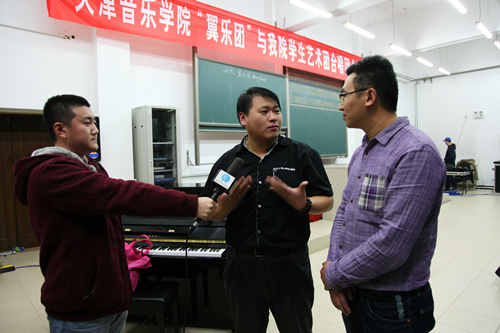 天津音樂(lè)學(xué)院“翼樂(lè)團(tuán)”帶隊(duì)老師與金沙城js93線路檢測(cè)中心學(xué)生藝術(shù)團(tuán)合唱團(tuán)指導(dǎo)老師張鵬接受學(xué)院電視臺(tái)采訪