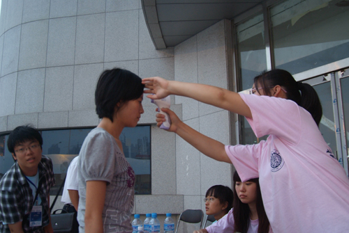 接站處備有體溫計,在新生報到時,學院迎新工作人員對新生進行體溫測量,并做好詳細記錄,隨時關注新生的體溫狀況,并對甲型H1N1流感的預防、感染癥狀做了重點說明和指導。