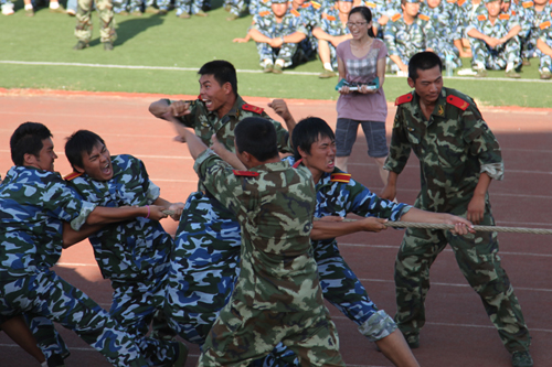 比賽以連為單位進行,同學們爭相參加,男生組有5支隊伍,每支20人,女生組有3支隊伍,每支20人組成拔河隊。隨著哨音響起,比賽開始了,吶喊聲隨即震耳欲聾,場上熱情高漲。隨即教官們之間的較量、教官與同學之間的友誼賽更是把本次比賽拉上了高潮。