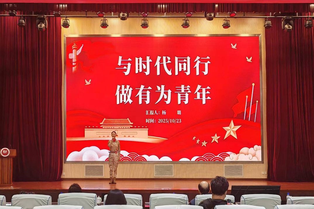決賽現場,楊璐同學首先回顧了青年時期的李大釗、周恩來和魯迅,是他們扛起了民族救亡的重擔。并回顧了自己的曾祖父,參加抗美援朝戰爭在身體上留下層層傷疤,親身感受到這一代人以血肉之軀筑起中華民族的鋼鐵長城。第二部分結合自身實際,回顧了自己五年的軍旅生活,不僅鍛煉了她強健的體魄,更讓她讀懂了理想與信仰、堅持與責任?,F在身為大學生的她,還有另一個身份——民兵。9月3日,作為民兵方隊一員走過天安門廣場,接受檢閱。她說:“當和那些‘最可愛的人’在一起,自豪感與使命感總會油然而生”。相信在未來前進的道路上,她一定會不忘初心,用實際行動書寫零零后的責任與擔當。最后,楊璐同學呼吁新時代的有為青年無需人人驚天動地,但必有赤誠初心。接過先輩的火炬,與時代同行,做有為青年,在祖國需要的地方綻放最美的青春之花!