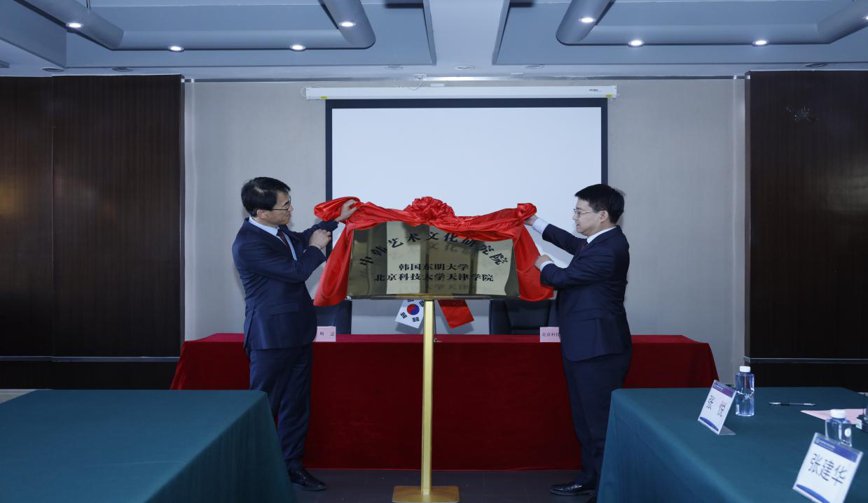 簽約儀式后舉行中韓藝術文化研究院揭牌儀式,由王斌院長與權重洛副校長共同揭牌。揭牌儀式后,王斌院長頒發聘書,聘請權重洛副校長為中韓文化發展研究院名譽院長,王東教授為名譽副院長。雙方交換校方紀念品,并拍照留念。