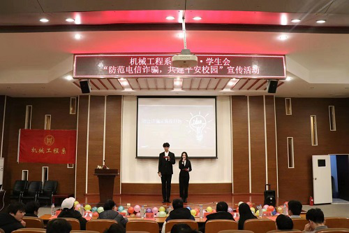 為維護(hù)我們安靜的學(xué)習(xí)環(huán)境,提高防范意識,使同學(xué)們在平時的生活中遠(yuǎn)離詐騙分子,圓滿的完成自己的學(xué)業(yè),機械工程系于12月1日下午5點在理工圖書館學(xué)術(shù)報告廳舉辦了以“防范電信詐騙,共建平安校園”的情景劇活動。此次活動到場的有機械工程系分團(tuán)委書記張軍老師、材料系19級輔導(dǎo)員韓子玉老師以及機械系分團(tuán)委、學(xué)生會主席團(tuán)和部長團(tuán)成員。