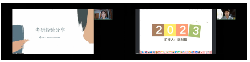 2019級徐鑫婷學姐和2018級陳劍鋒學長結合自身的考研經歷,先后圍繞院校選擇、考研流程、考研備考策略、名師及書目的選擇、科目復習、調整自身學習狀態、考研復試方面的心得感悟等方面向同學們做了詳細的介紹,并就如何高效制定學習計劃、如何提高有效的學習時間給出了各自的意見,為同學們提供了參考。