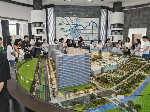 參觀訪問的第一站是北京昌平合生匯,昌平合生匯目前正在緊鑼密鼓地籌備中,預計在今年年底對外營業,需要實習生參與到繁忙的籌備建設中,所以這里是參觀訪問的第一站。張婷婷是第三屆合生商業精英班的學員,此時正在昌平合生匯項目組工作,由她帶領大家參觀了項目建設情況并來到接待處給同學們介紹項目未來的發展規劃和對于實習崗位的需求狀況。
