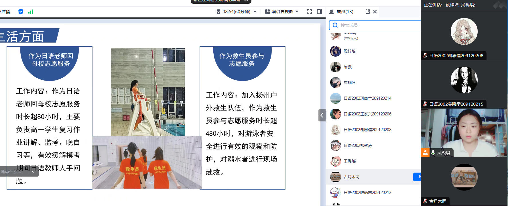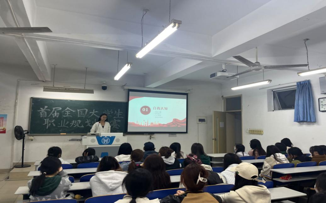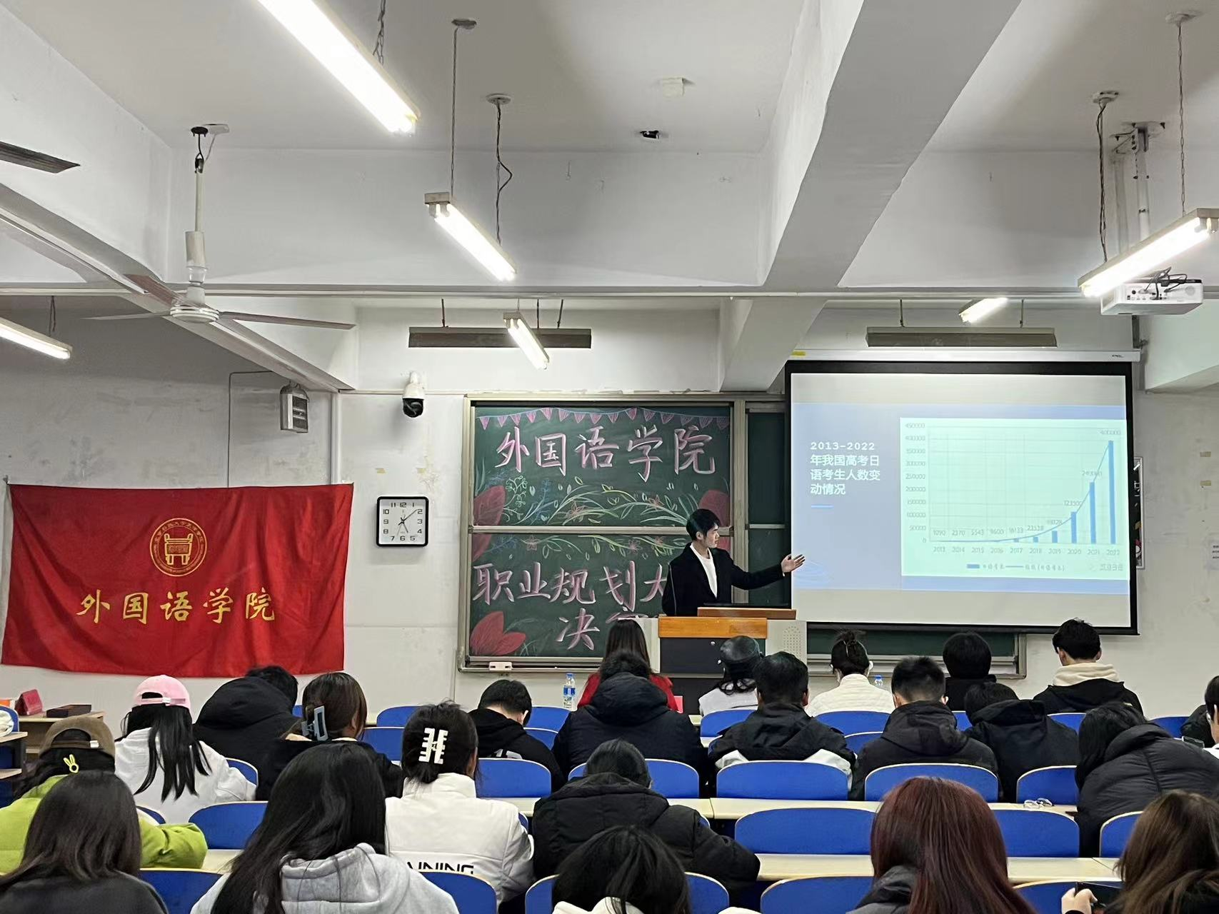 本次大賽分為班級(jí)賽和院賽復(fù)審、決賽三個(gè)階段。選手們通過提交職業(yè)生涯發(fā)展報(bào)告、個(gè)人陳述視頻、生涯展示PPT,結(jié)合職業(yè)目標(biāo)、行動(dòng)成果、目標(biāo)契合度等方面對(duì)生涯報(bào)告進(jìn)行陳述和展示,通過分析市場(chǎng)需求和個(gè)人發(fā)展前景,制定了切實(shí)可行的職業(yè)規(guī)劃。最終,2023年11月8日在9教104舉辦本次大賽院賽決賽,外國(guó)語學(xué)院黨總支書記吳思、日語教研室主任孔令蕾老師以及各年級(jí)輔導(dǎo)員出席并擔(dān)任評(píng)委。