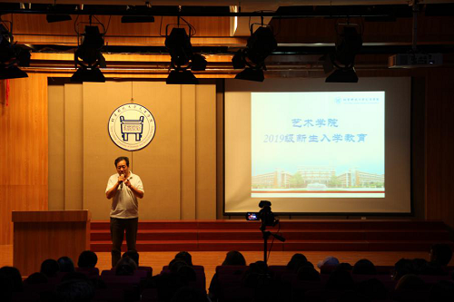 胡寶嘉院長介紹了藝術學院的基本情況,希望2019級新生“學知識、學做人、學做事”,度過充實美好的大學生活。