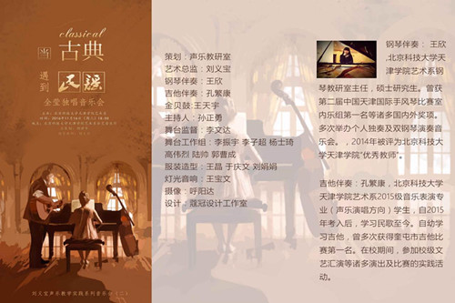 2016年11月16日18:00時(shí),在北京科技大學(xué)天津?qū)W院藝術(shù)系弘藝音樂廳,成功舉辦了由藝術(shù)系聲樂教師劉義寶指導(dǎo)策劃的“當(dāng)古典遇到民謠——全瑩獨(dú)唱音樂會(huì)”劉義寶聲樂教學(xué)實(shí)踐系列音樂會(huì)(二)。本場(chǎng)音樂會(huì)由劉義寶老師擔(dān)任藝術(shù)總監(jiān)和指導(dǎo)教師,鋼琴教研室主任王欣老師擔(dān)任鋼琴伴奏,2015級(jí)學(xué)生孔繁康擔(dān)任吉他伴奏,王天宇擔(dān)任鼓手,2014級(jí)學(xué)生孫正勇?lián)沃鞒秩恕?/p>