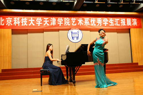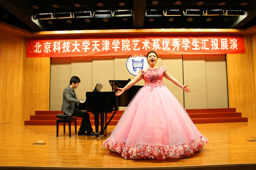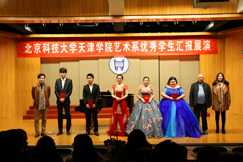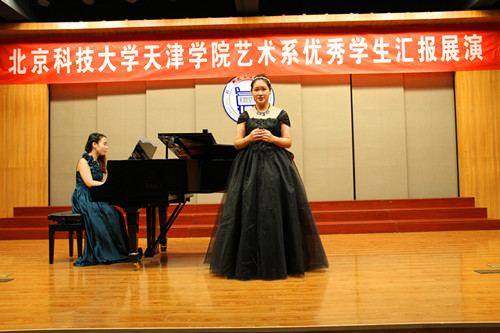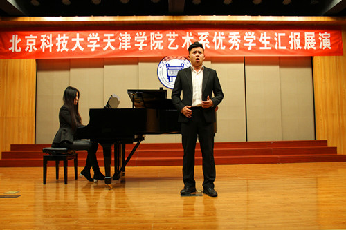2015年11月11日18:30,北京科技大學(xué)天津?qū)W院藝術(shù)系優(yōu)秀學(xué)生匯報展演在12教學(xué)樓弘藝音樂廳舉行。 在藝術(shù)系聲樂1401班王明明同學(xué)和聲樂1302班魏欣同學(xué)的精彩開場白后,演出正式拉開了帷幕。