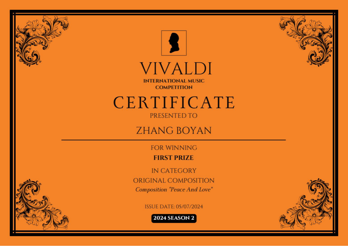 學生張博研榮獲2024年“維瓦爾第”國際音樂比賽一等獎