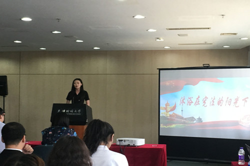 為深入貫徹落實黨的十九屆二中全會精神,法律系師生深入開展尊崇憲法、學習憲法、遵守憲法、維護憲法、運用憲法的宣傳教育活動,大力弘揚憲法精神,大力弘揚社會主義法治精神,不斷增強師生憲法意識。法律系5月初起,積極準備2018年天津市學生“學憲法講憲法”主題演講比賽。通過系內選拔,最終確立參賽選手為法律系法學1601班學生李雨萌,于2018年5月31日在天津財經大學參加比賽。