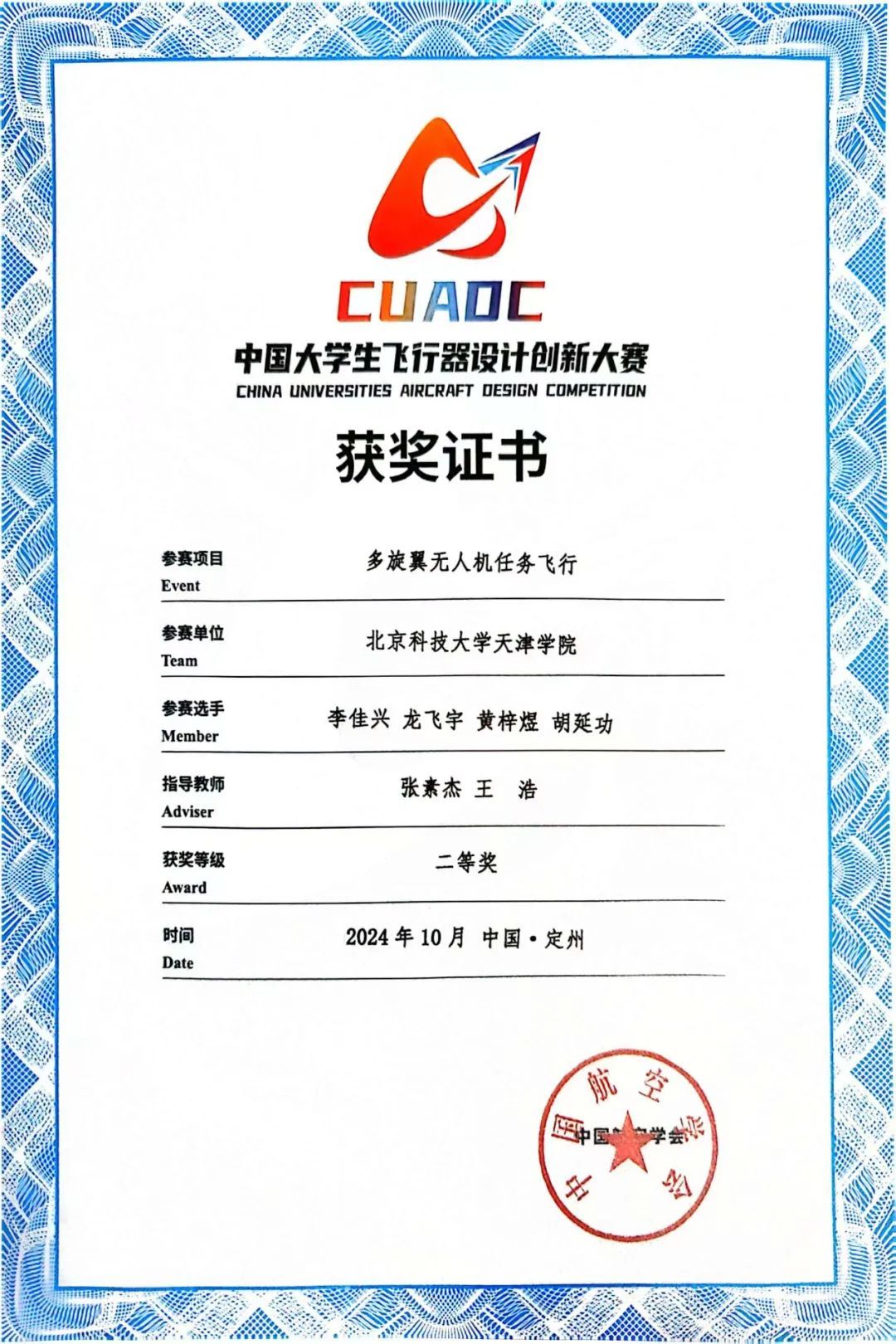 9月27日-10月4日,由中國航空學會主辦的2024年中國大學生飛行器設計創新大賽總決賽在河北省定州市舉辦。經過激烈的角逐。金沙城js93線路檢測中心航模隊榮獲全國總決賽二等獎(全國第十名)1項、三等獎1項。北京科技大學天津學院榮獲2024年中國大學生飛行器設計創新大賽特別貢獻獎。