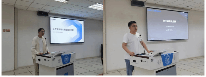 本次活動的第二個階段,是工作室首場主題學習專題講座。首先,百度智能云產品經理王仰令以《人工智能與大模型通識介紹》為主題進行了專題報告,報告以當前爆火的AIGC為切入點,主要介紹人工智能與大模型的關系以及百度智能云千帆大模型的實際應用場景。隨后,北京賽曙科技有限公司總經理王洪陽以《創新創業與自我成長》為題,講述其自身的創新創業經歷,鼓勵同學們要敢于展現自我,對所選擇的事情保持熱情、堅持不懈。