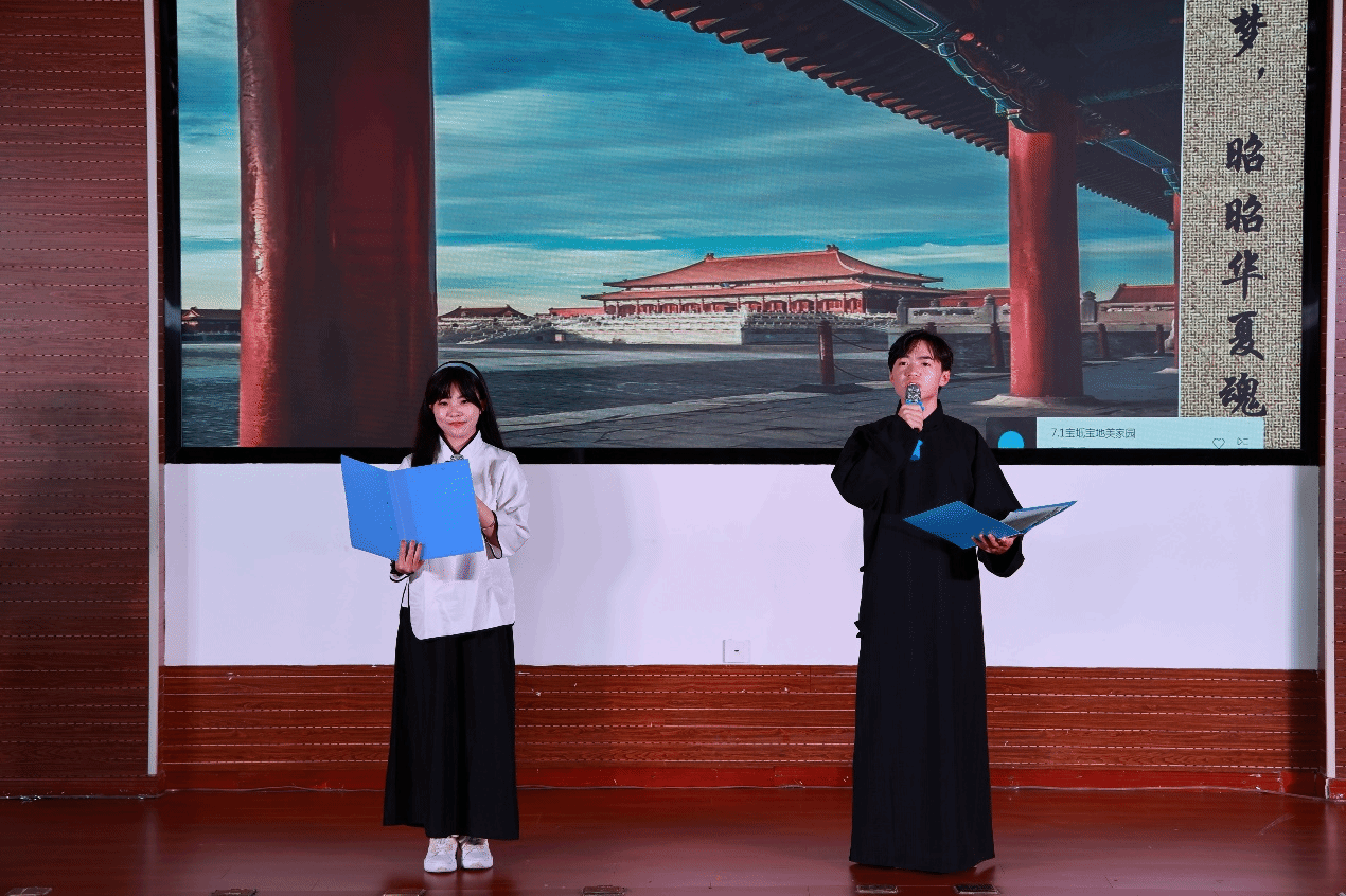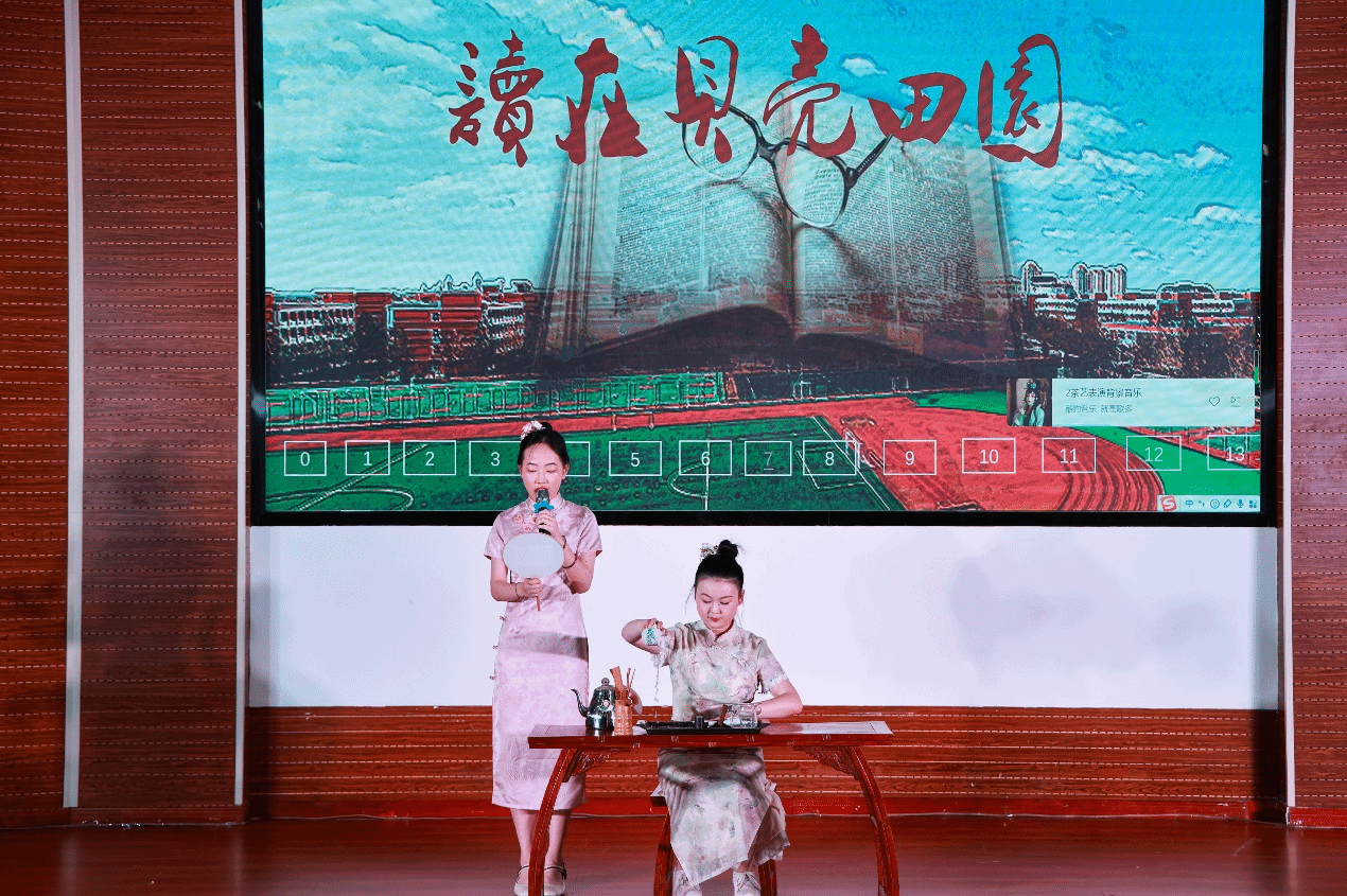 讀書文化節(jié)晚會在圖書館館員鄭妍和邢智軒帶來歌曲《讀書之歌》中拉開帷幕,歌聲以溫馨、勵志、正能量的氛圍讓現(xiàn)場聽眾仿佛陷入書的海洋,飽覽它的嫵媚與壯麗、感受歲月無法侵蝕的力量。余音未絕,學(xué)生藝術(shù)團(tuán)茶筵社獻(xiàn)上茶藝表演《茗紅飄香》,通過對紅茶沖泡技藝的形象演示,生活化地給觀眾展示泡飲過程,使觀眾在優(yōu)雅環(huán)境氛圍中得到美的享受和情操的熏陶;師生同臺太極書法《文墨武韻》上演,陳學(xué)思同學(xué)在推柔虛實、連綿暢順、行云流水的招式中與圖書館館員李朋洋、施念來同學(xué)揮灑自如的落筆有“異曲同工”之妙,共同彰顯出中國傳統(tǒng)文化之瑰麗;配音表演《這盛世如你所愿》極富感染力,讓我們時刻銘記先烈們的犧牲、珍惜當(dāng)下幸福生活;歌曲《閱讀有光》點燃我們內(nèi)心的火焰且增強無懼風(fēng)雨,勇往直前的勇氣;《琵琶行》用音樂來表達(dá)意境,將聽覺抽象為一種視覺的形象,展現(xiàn)了人類用文字描寫聲音的極致,極具美感。漢服舞蹈《禮儀之邦》,歌曲《少年中國說》也迎來陣陣掌聲。