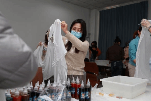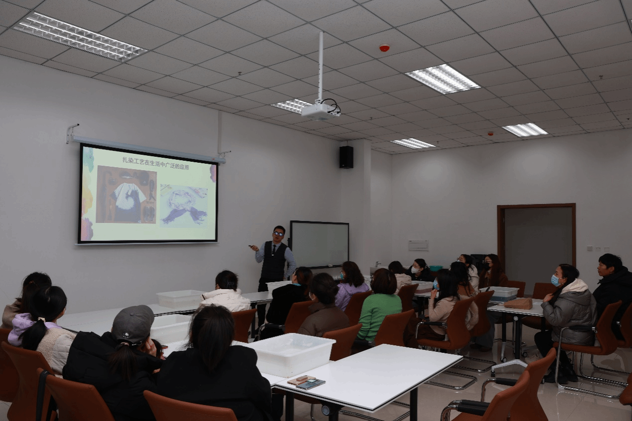 為全面貫徹黨的二十大精神,弘揚傳統民族文化,豐富女教師文化生活,激發對傳統技藝的興趣,2023年12月1日,在教師發展中心勵學坊,由學院工會和圖書館聯合舉辦“巧手來扎染”女工活動,工會主席郭雅娟、女工委員班嵐、圖書館參考咨詢部主任吳素舫等近40名教職工參加此次活動。