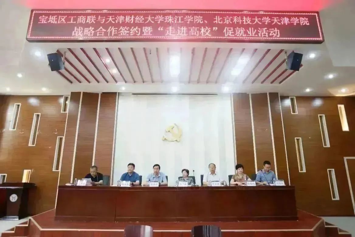 5月31日下午,寶坻區(qū)工商業(yè)聯(lián)合會與天津財經(jīng)大學(xué)珠江學(xué)院、北京科技大學(xué)天津?qū)W院戰(zhàn)略合作簽約暨“走進(jìn)高校”促就業(yè)活動在金沙城js93線路檢測中心理工館報告廳成功舉行。天津市工商聯(lián)黨組成員、一級巡視員牛予其,寶坻區(qū)人大常委會副主任、工商聯(lián)主席艾玉昆,京津新城黨工委書記、周良街道黨工委書記吳鳳雙,寶坻區(qū)工商聯(lián)黨組書記、常務(wù)副主席孫雅梅,天津財經(jīng)大學(xué)珠江學(xué)院黨委書記靳術(shù)海,北京科技大學(xué)天津?qū)W院黨委書記葉振楠、副院長張永鋒、黨委副書記栗時鋒及相關(guān)負(fù)責(zé)同志、企業(yè)家和師生代表等100余人參加簽約儀式,儀式由寶坻區(qū)工商聯(lián)副主席王永盛主持。