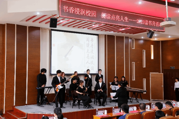 此次讀書(shū)節(jié)晚會(huì)在未亭民樂(lè)團(tuán)帶來(lái)的《市集》中拉開(kāi)帷幕,古箏、二胡、笛子、貝斯、鍵盤(pán)以及打擊樂(lè)等中西樂(lè)器合奏,體現(xiàn)了校園文化的豐富多彩。