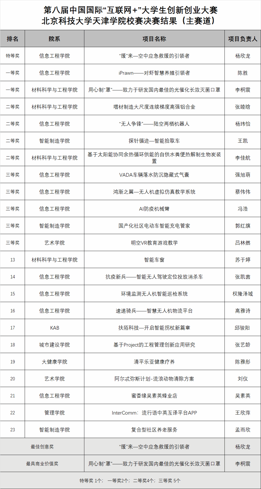 決賽開始后,現(xiàn)場33支創(chuàng)業(yè)團隊按照抽簽順序向評委介紹展示各自創(chuàng)業(yè)項目,評委對項目進展、商業(yè)模式、財務(wù)狀況、團隊組建和未來規(guī)劃等方面進行提問,參賽隊員限時回答,之后評委給出分數(shù)。經(jīng)過激烈角逐,評選出主賽道特等獎 1個,一等獎2個,二等獎4個,三等獎 5個;紅旅賽道一等獎 1個,二等獎1個,三等獎3個。17個校級優(yōu)秀項目將擇優(yōu)推薦參加第八屆中國國際“互聯(lián)網(wǎng)+”大學(xué)生創(chuàng)新創(chuàng)業(yè)大賽天津賽區(qū)比賽。