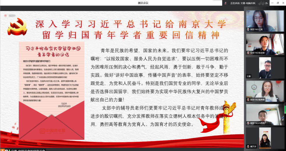 在組織生活上,黨支部書記文勇帶領大家學習了習近平總書記給南京大學留學歸國青年學者重要回信精神,并傳達了關于學習校園疫情防控措施和高質量完成學業、畢業、就業等工作的相關要求。