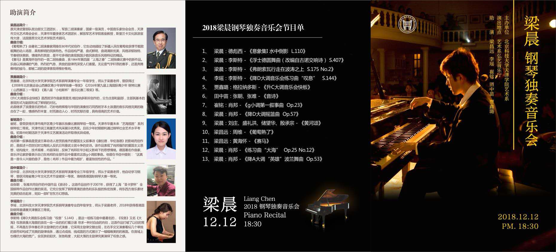12月12日18:30,由北京科技大學(xué)天津?qū)W院藝術(shù)系主辦的“2018梁晨鋼琴獨奏音樂會”在12教學(xué)樓弘藝音樂廳成功舉行。北京科技大學(xué)天津?qū)W院黨委副書記牛犁,學(xué)術(shù)委員會主席宋存義,教務(wù)處長張建華,城市建設(shè)學(xué)院院長劉勝富...